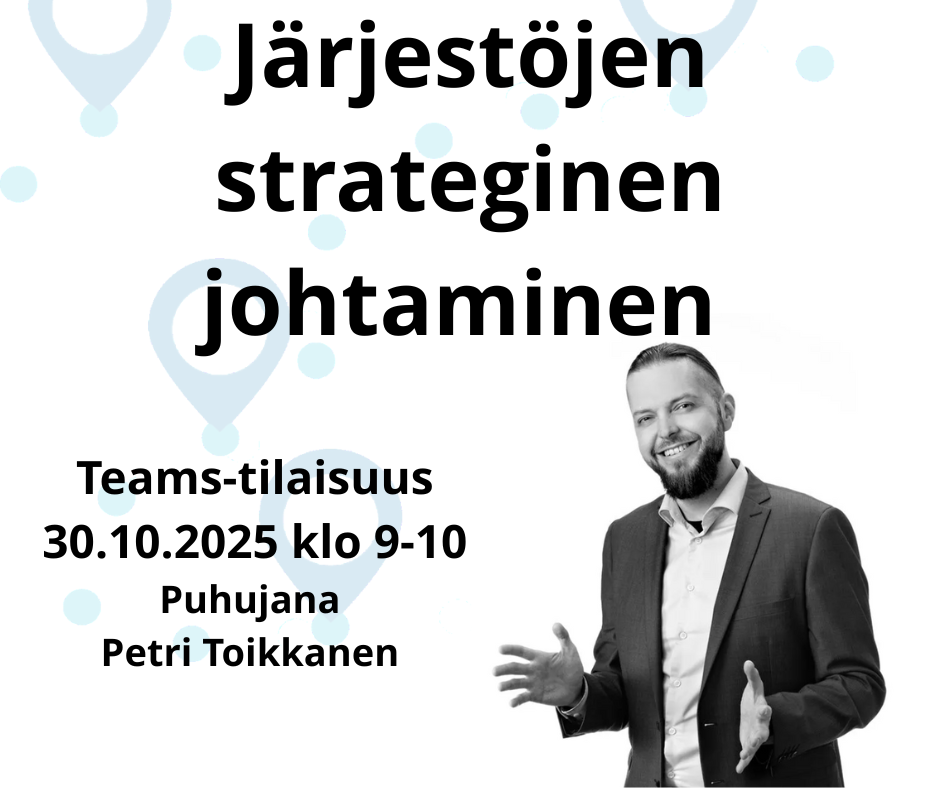 Onnistumista tukevat hyvä strategia, laaja-alainen strateginen ajattelu ja jämäkkä strateginen johtaminen. Näiden teemojen äärelle on mahdollisuus kokoontua 30.10.2025. Tilaisuuden puhujana toimii strategiantekijä Petri Toikkanen, jolla on yli 15 vuoden kokemus järjestöjen strategisesta kehittämisestä. Petri on auttanut yli 50 järjestöä menestymään strategiatyössään ja kouluttanut strategisesta johtamisesta satoja järjestöjohtajia.